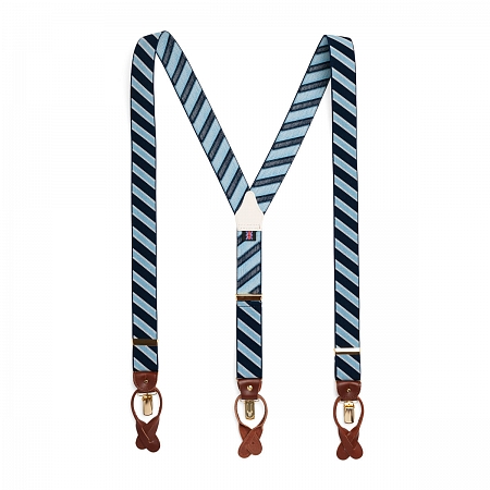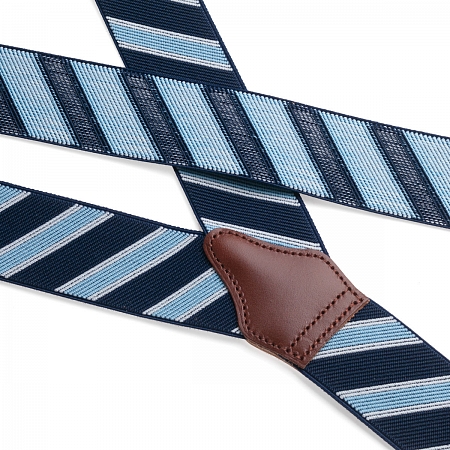 Albert Thurston Blue Slash — это добротные и удобные подтяжки английского производства, сшитые из очень прочной синтетической ткани в диагональные полоски синих цветов.