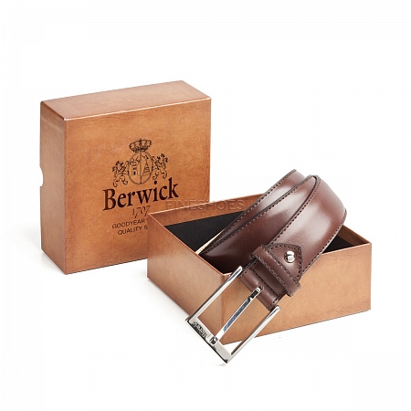 На роль основного материала для этого ремня была отобрана гладкая кожа телёнка с очень лёгким блеском — box calf. Для подкладки использовали неокрашенную кожу. Края ремня Berwick Boxcalf Dark Brown аккуратно прошиты, окрашены и отполированы. Пряжка серебристого цвета обладает классической прямоугольной формой и дополнена выгравированным логотипом бренда. Упомянуть стоит и подарочную коробку, в которой поставляется ремень — она красиво и благородно выглядит.