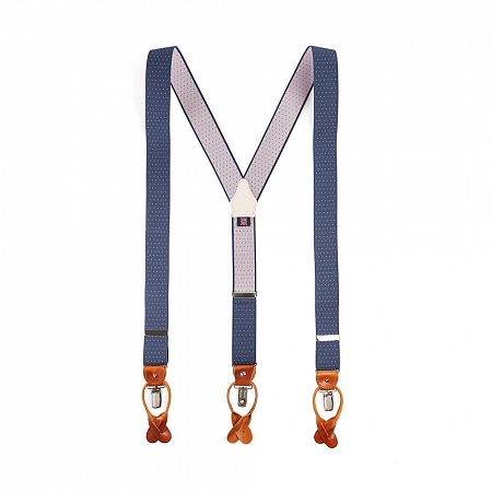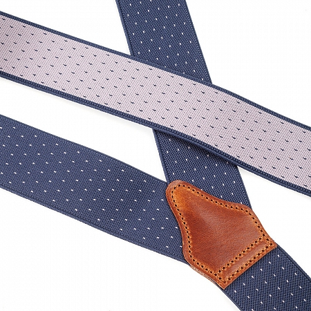 Albert Thurston Blue — это классические подтяжки английского производства, сшитые из синтетической ткани высокого качества с узором в белый горошек. Они оснащены наконечниками из натуральной кожи и металлическими зажимами, так что их можно крепить к брюкам тем способом, который вам больше нравится. Крепление на петлях и пуговицах считается более традиционным и элегантным, но если вы отдадите предпочтение именно