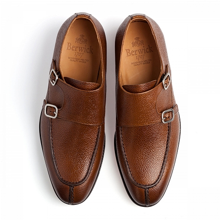 Berwick 3143JR Brown Grain — это монки с двумя пряжками и так называемыми норвежскими мысами (Norwegian toes), которые характеризуются приподнятыми швами. Мы советуем носить данную модель с джинсами и непарными брюками из хлопкового и шерстяного твила, вельвета, молескина, фланели. Подойдут к ней и многие неформальные костюмы (например, фланелевые). Не бойтесь сочетаний с брюками и костюмами, которые темнее туфель; так, в данном случае отличным выбором могут оказаться вещи тёмно-коричневого и тёмно-синего цветов.