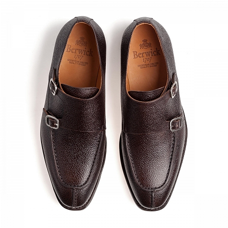 Berwick 3143D Dark Brown Grain — это монки с раздвоенными мысами и рельефными полукруговыми швами, сшитые из тёмно-коричневой кожи с зернистой фактурой. Такая неординарная модель безупречно смотрится с классическими джинсами, разнообразными вещами из твида, а также брюками и костюмами из других фактурных и/или достаточно толстых материалов (в частности, подойдут не слишком тонкие чиносы). В плане цветов брюк и костюмов ограничения минимальны, потому что с тёмно-коричневой обувью способны отлично смотреться зелёные, бежевые, синие, серые и ещё некоторые другие изделия.
