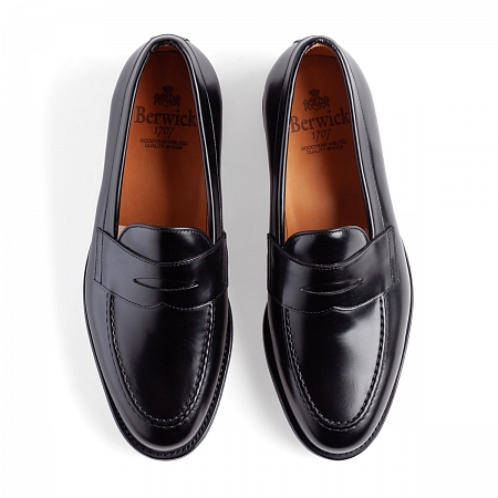 Berwick 9628D Black Rois — это добротные и универсальные пенни лоферы, сшитые из полированной телячьей кожи, внешне напоминающей кордован. Они прекрасно гармонируют со множеством непарных брюк, не слишком формальных костюмов и джинсов. Цвет брюк или костюмов может быть и серым, и синим, и коричневым.