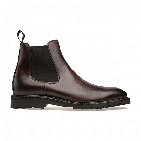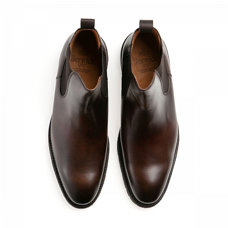 Berwick 303V Dark Brown Toledo — это ботинки челси (chelsea boots), сшитые из гладкой кожи темно-коричневого цвета на резиновой подошве Vibram. Выразительный внешний вид этой модели придаёт живописная окраска, выполненная вручную. Благодаря классическим, универсальным оттенкам потенциал сочетаемости этих челси широк: вы можете комбинировать их с большинством костюмов (кроме чёрных и очень тёмных серых), а также с джинсами и непарными брюками из хлопкового твила, твида, молескина, вельвета и шерстяной фланели.