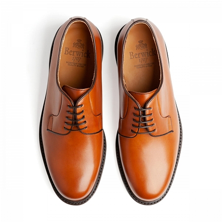 Berwick 3680 Vegano Tan — это туфли-блюхеры, выполненная из гладкой кожи светло-коричневого цвета. У блюхеров, как и у дерби, шнуровка открытая, но дырочки для шнурков располагаются на очень маленьких берцах. Такие модели обладают невысокой степенью формальности, но гармонируют с рядом костюмов из фактурных и/или толстых тканей. Кроме того, их можно носить с джинсами, чиносами, непарными брюками из вельвета, твида, молескина и шерстяной фланели.