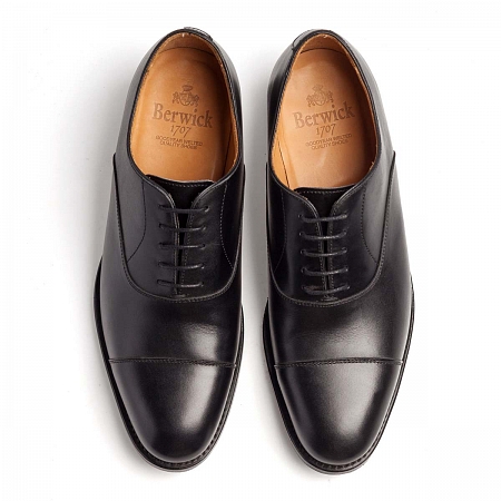 Berwick 4343 Black — это классические и очень строгие туфли оксфорды чёрного цвета. Мы рекомендуем комбинировать их с деловыми костюмами, однако они могут хорошо смотреться и с рядом неформальных костюмов, а также со многими непарными брюками со стрелками (в первую очередь шерстяными, но и некоторые хлопковые модели допустимы). Цвет брюк или костюмов может быть чёрным, серым, синим (лучше довольно тёмным).