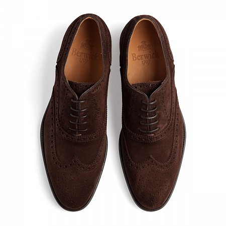 Berwick 3008 Dark Brown Suede — это элегантные замшевые оксфорды с декоративной перфорацией на мысках и вдоль всех швов. Они сшиты в конструкции Goodyear Welted и поэтому стоят сравнительно недорого. Мы советуем комбинировать их с твидовыми, льняными, хлопковыми и фланелевыми костюмами и непарными брюками, а также с джинсами. Подойдут и некоторые другие предметы гардероба с невысокой степенью официальности. Они могут быть окрашены как в очень светлые цвета типа кремового и белого, так и в тёмные тона синего,серого и зелёного цветов.