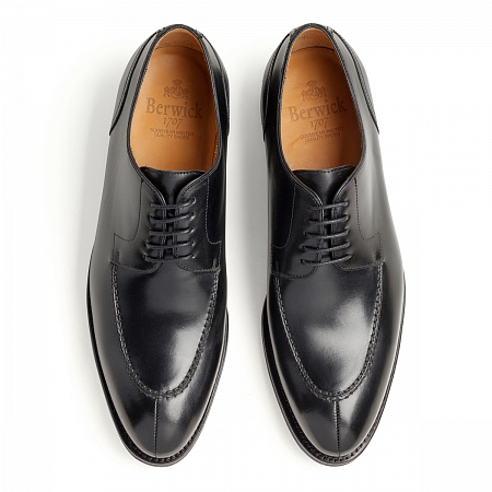 Berwick 3566D Black — это туфли с открытой шнуровкой и норвежскими раздвоенными мысами (Norwegian split toes). Такая модель является неформальной, хотя верх из черной гладкой кожи придаёт ей довольно строгий внешний вид. Мы рекомендуем сочетать такие туфли с тёмными костюмами из твида и фланели, а также с непарными брюками тёмных тонов из фактурных или толстых тканей. Кроме того, они могут хорошо смотреться с тёмно-синими джинсами.